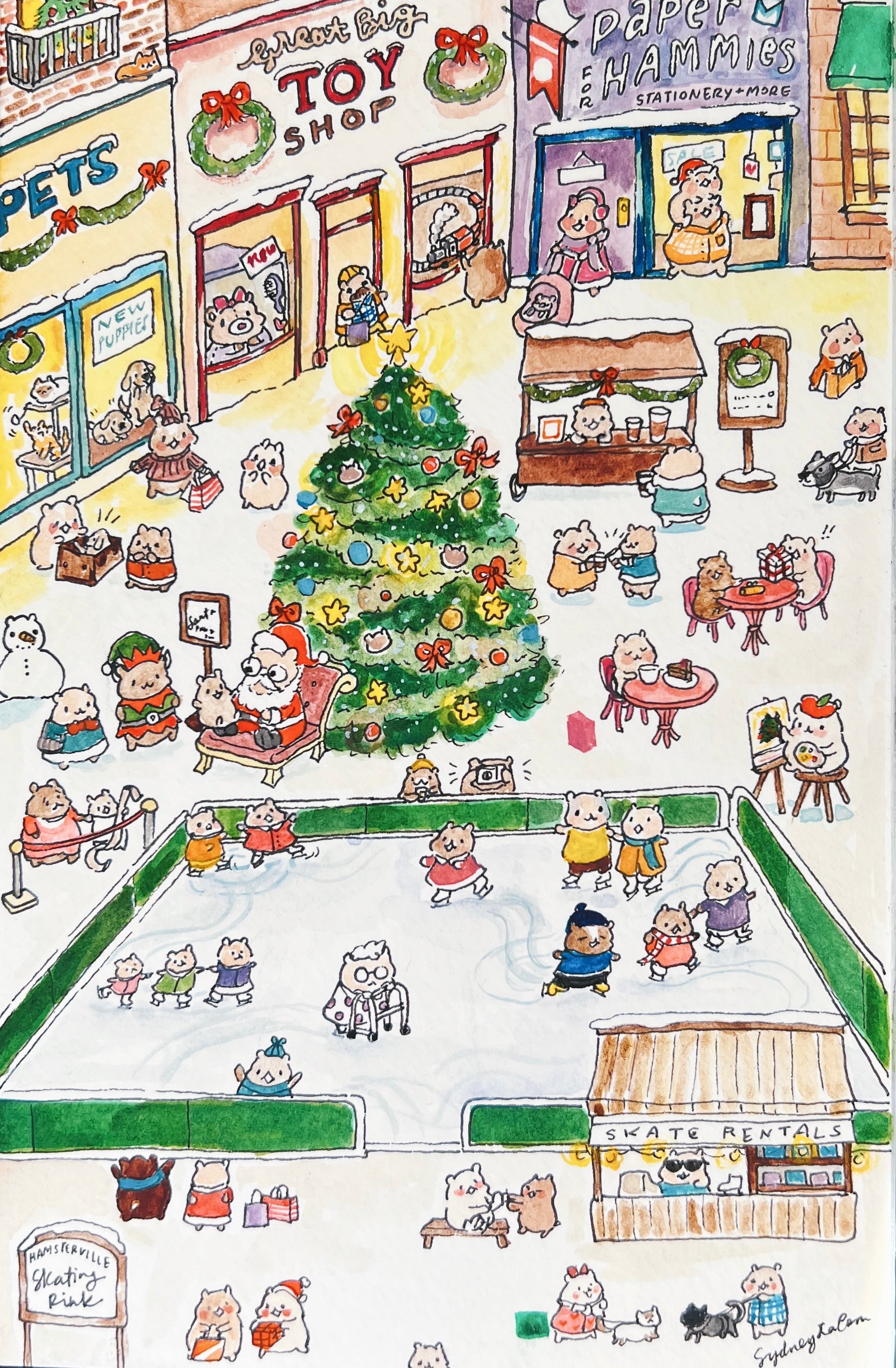 Printed from my original ink and watercolor painting, this art print features a bustling Hamsterville at the height of Christmas shopping season.
