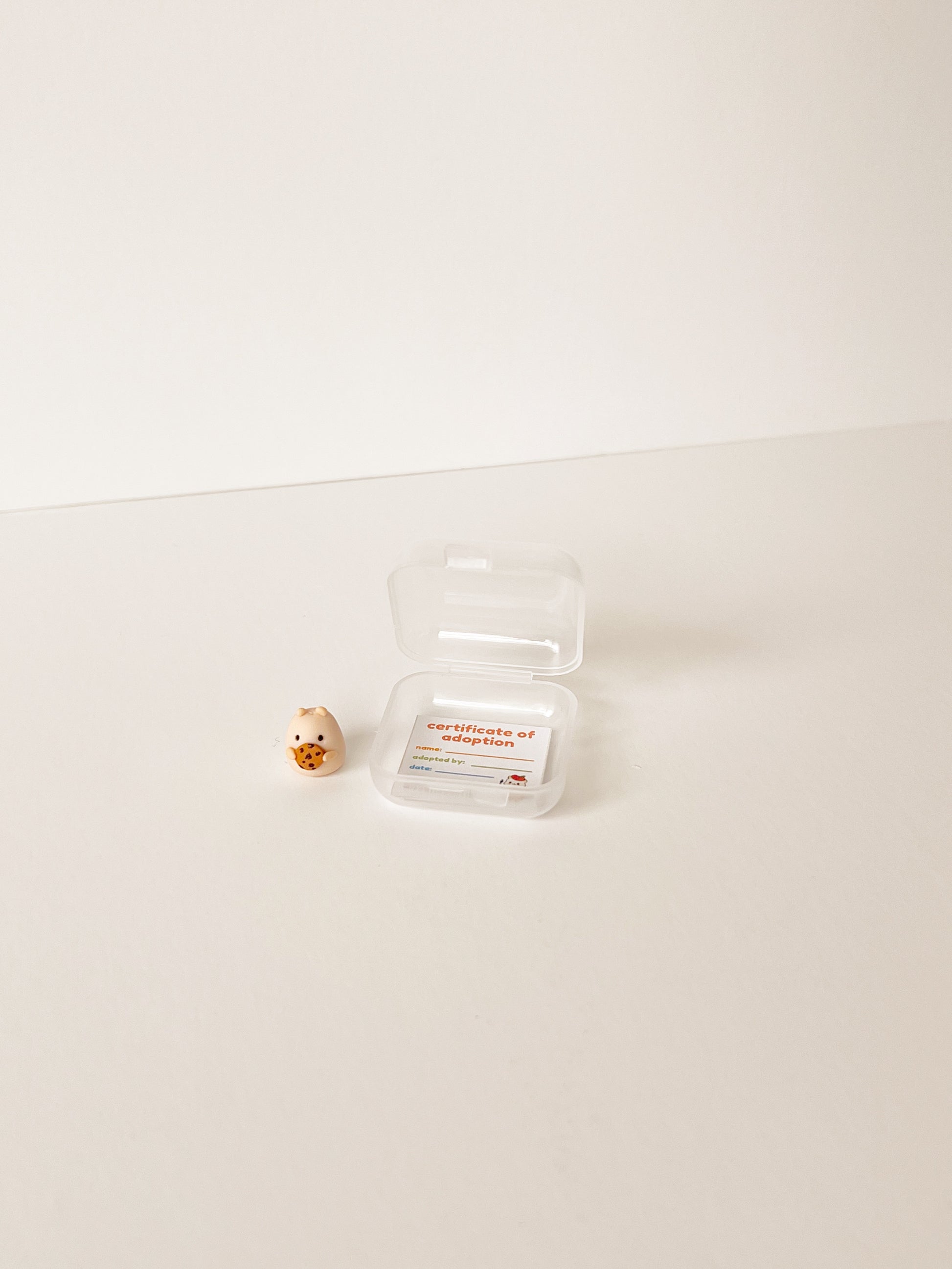 Meet Cookie Hammy, the sweetest addition to Hamsterville! This tiny, hand-sculpted polymer clay hamster is holding a delicious chocolate chip cookie, ready to bring a smile to your face. Each clay buddy comes with a special tiny adoption certificate, making it the perfect companion for any hammy fan. Whether you're a collector or just looking for a cute, whimsical gift, Cookie Hammy is sure to steal your heart. Add him to your Hamsterville family today!