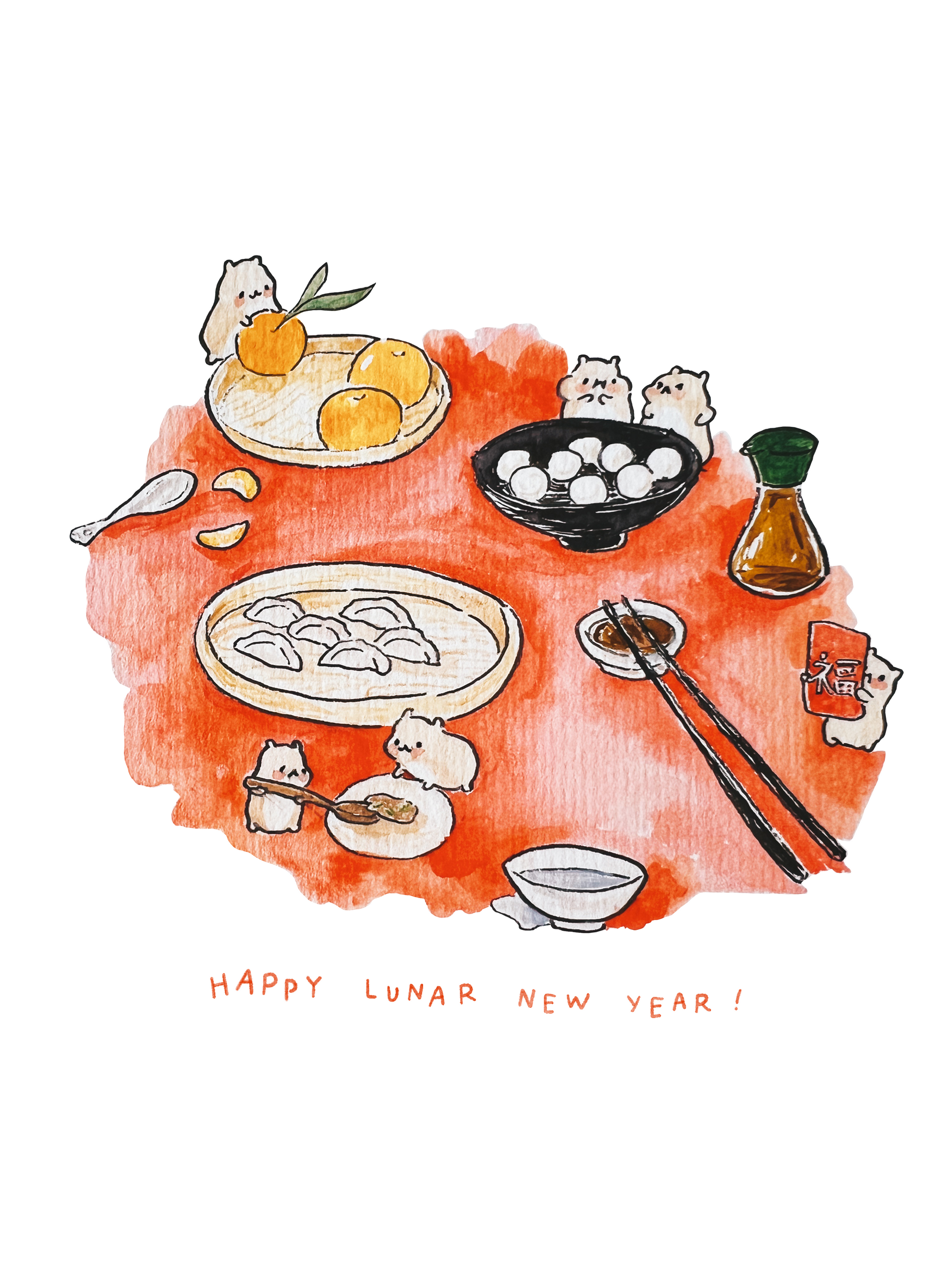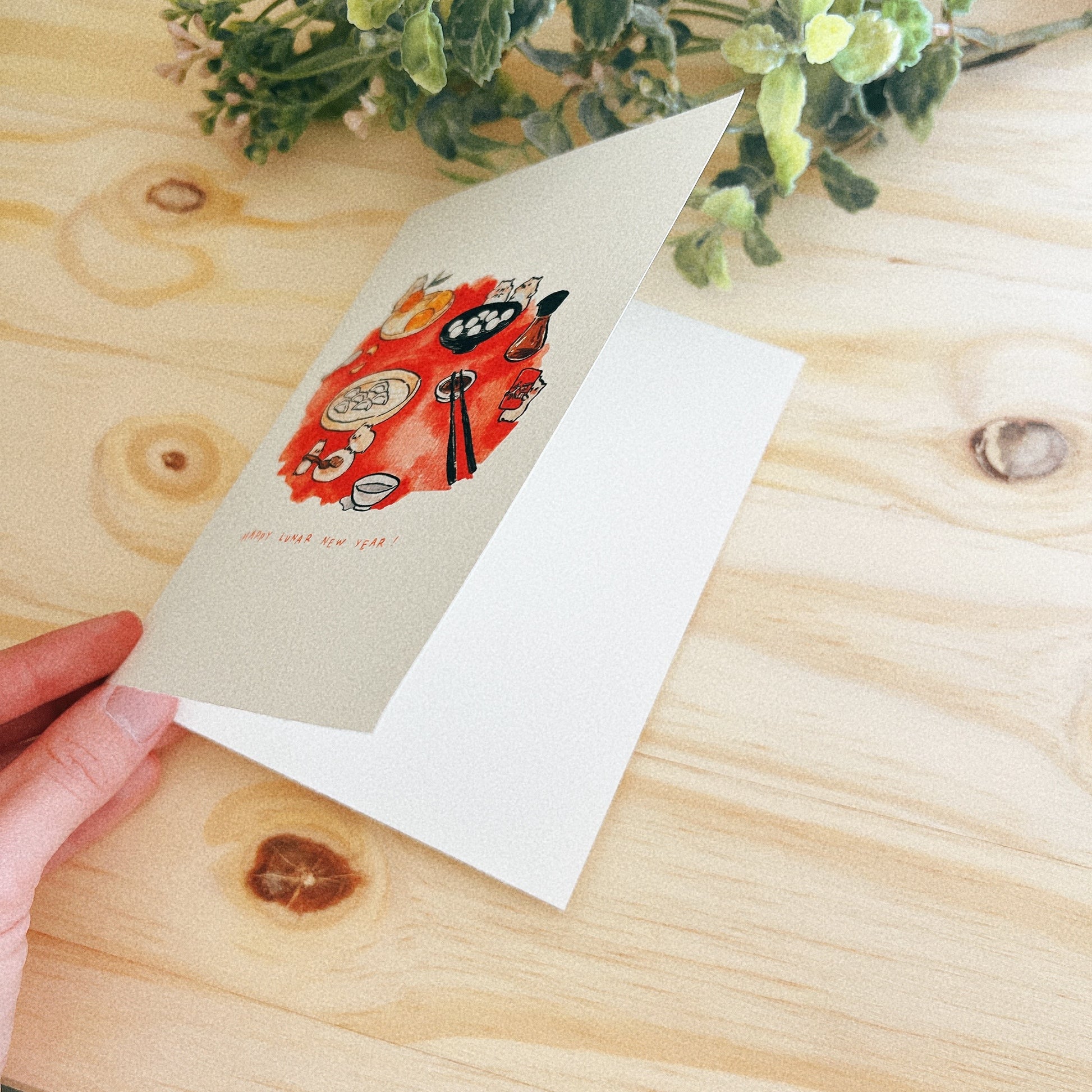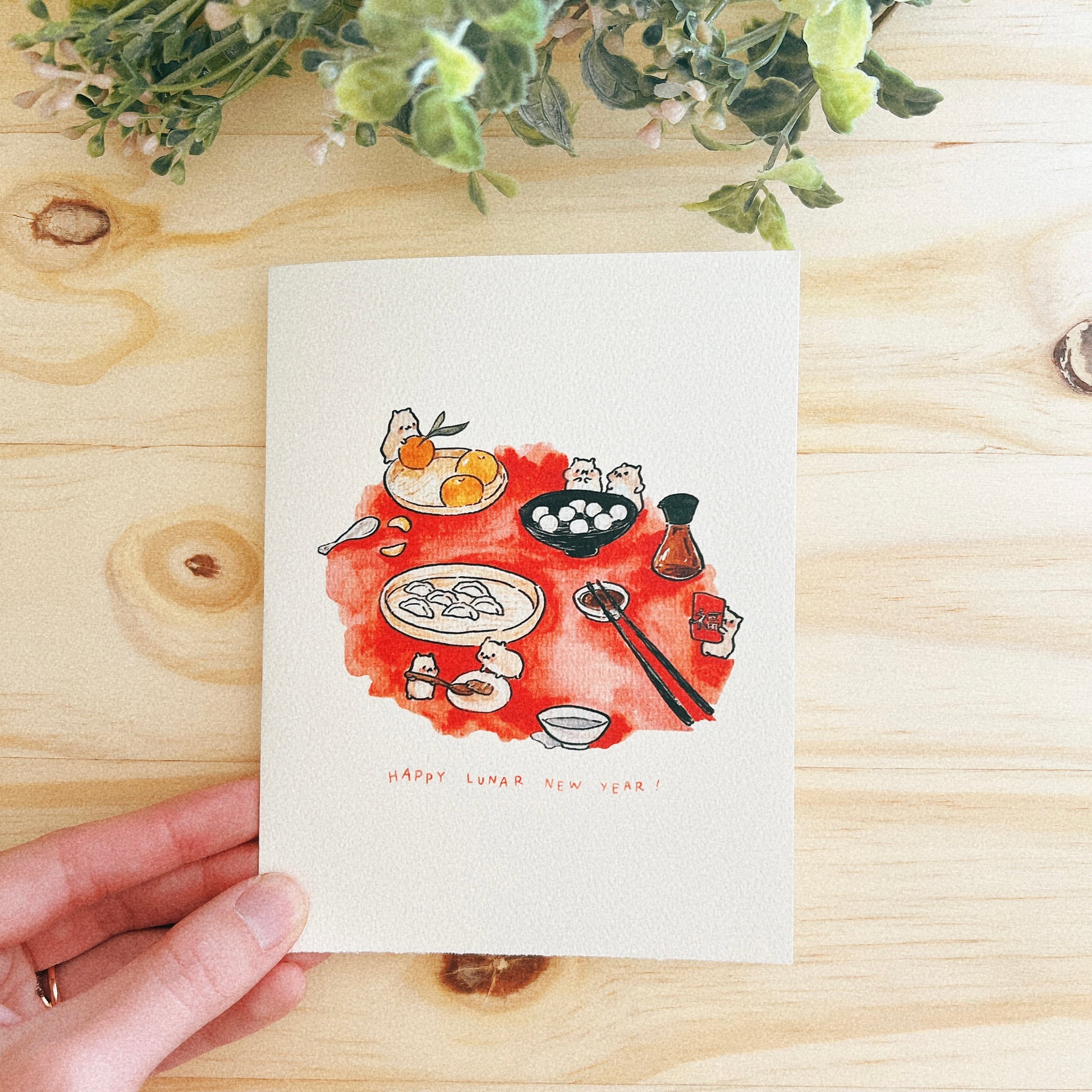 Printed from my original watercolor design on textured paper, this card features little hammies preparing a traditional feast for the Lunar New Year.
